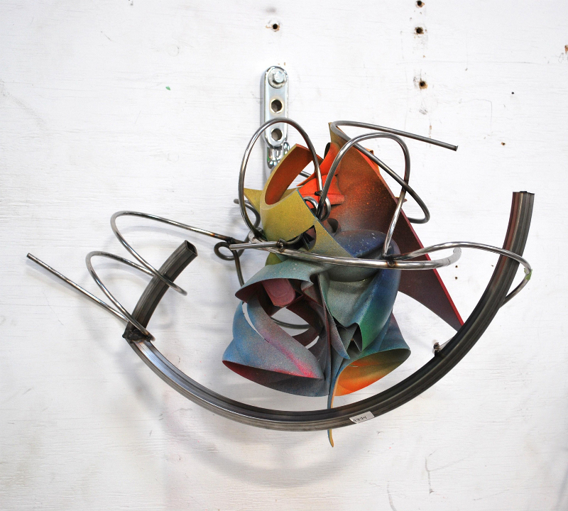 The idea is that contemporary abstraction like Stella’s has its theoretical roots in Kandinski’s trailblazing work, and despite the artists’ differences — just about 100 years worth of differences — there’s a visual dialogue that results from the pairing. Also evident is the merging of painterly and sculptural space, as Stella’s objects, mostly hanging on the walls like paintings, offer steel armatures that appear to function like the gestural brush strokes in Kandinski’s work.