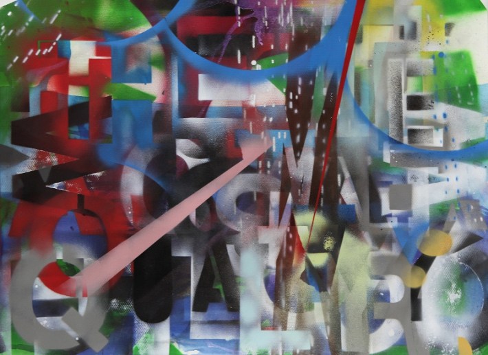 Gestural abstraction perseveres, and in Washington, D.C. few artists have been as attuned to its provisional potential as Maggie Michael (NAP #94). With There is No Rising or Setting Sun, Michael’s fourth solo show at G Fine Art, the artist has largely left the drips and splatters behind in favor of spray paint and stencils in provisional works on paper, canvas and mylar. And she’s expanded her mark making across the picture plane — gone are the central points that anchored many of her previous paintings. While immediately next door Conner Contemporary asks rhetorically Is Realism Relevant? Michael’s thoughtful consideration of abstraction formulates compelling answers of her own.