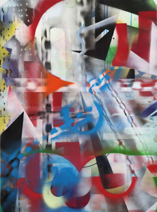 About 2 Circles (Ghosts of Lissitzky), 2011, spray paint and tape on paper and mylar. Image Courtesy of the artist and G Fine Art