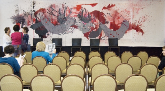 Visitors get ready for the talk “Emerging Art / Emerging Practices.” Weft, by Kathering Tzu-Lan Mann hangs in the background.
