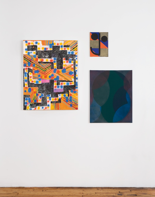 Installation view, The Working Title. (L to R) Keltie Ferris, Black Power, 2010; Joshua Abelow, Self-Portrait, 2010; Halsey Hathaway, Untitled, 2010