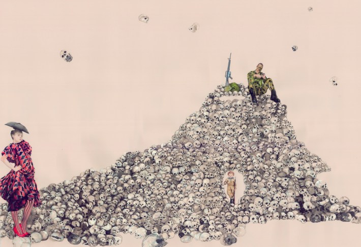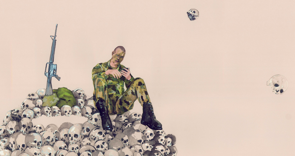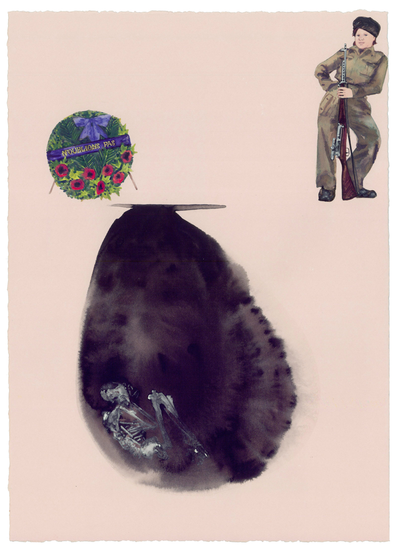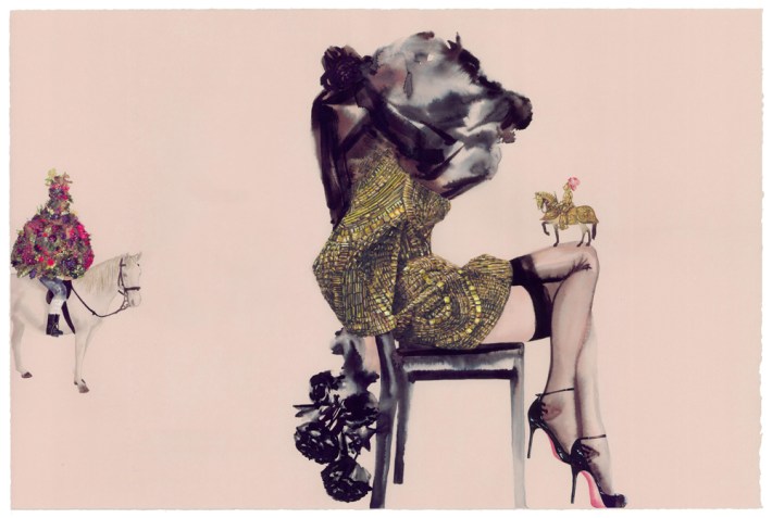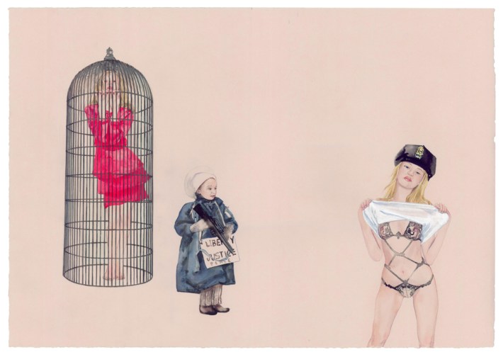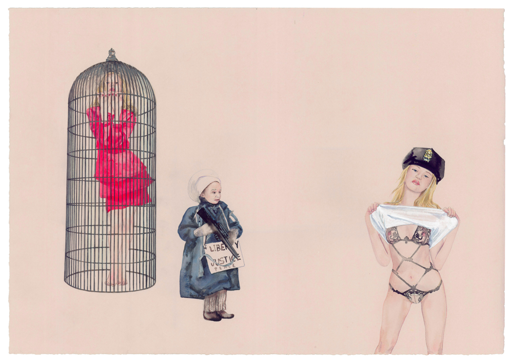 Dawn Black’s second solo show at Curator’s Office in Washington, D.C. doesn’t veer too far from her first go in 2009. Pulling characters from her ongoing Conceal Project, her current show, The Magic Foxhole, uses J.D. Sallinger’s unpublished short story of the same title — an absurdist tale about the follies of war — as a point of departure. Like her previous exhibition, Black’s own absurdist scenes subvert context in detailed ink, gouache and watercolor works on paper. And instead of narratives, the artist offers her nuanced understanding of the power roles and cues that result from masquerade and from our propensity for playing dress up.