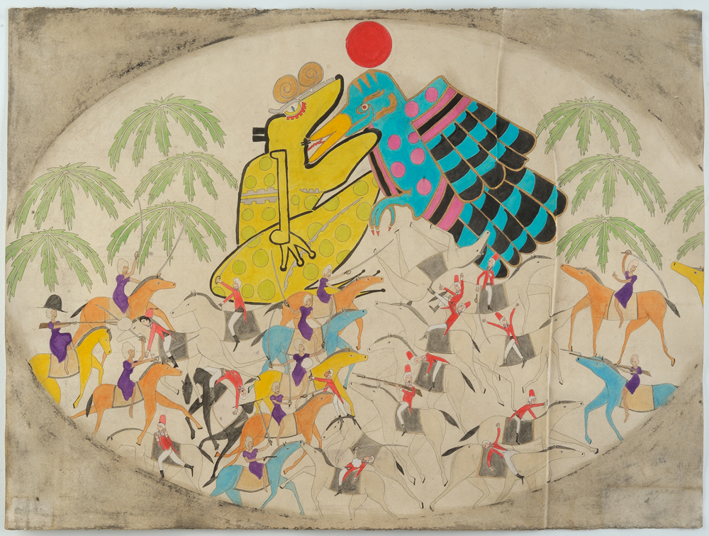“Gongasriikan mercenaries in the employ of the Frenglish Republic”, 2012, Ink, acrylic, coffee, tea on paper, 43 1⁄2 x 30 1⁄4 inches (courtesy Heiner Contemporary and the artist)