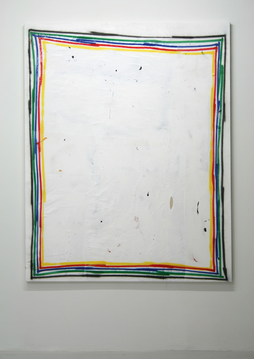 His three paintings are ever-so-slight variations on the same theme — spray painted lines in yellow, red, blue, green, and black that track the edges of a rugged white canvas. The variants here, then, are Ostrowski’s crooked lines, and his meticulous stammering is what ultimately becomes the subject of his work.