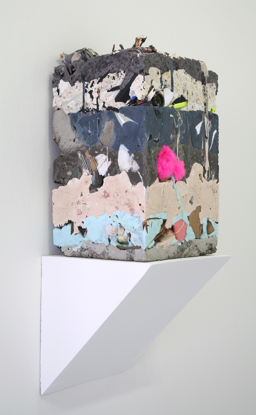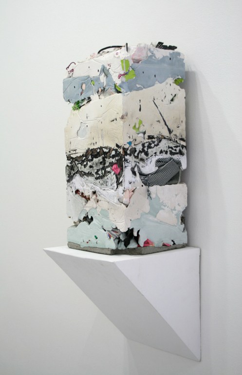 Jack Henry’s conceptual counterpoint to Ostrowski’s dexterous imperfections are the discarded objects that he encases in resin cores like geological markers. Look closely at Henry’s sculptures and you’ll find a hubcap, discarded plywood, a couple of plastic shopping bags — the sorts of things that might wash up along the banks of your local urban stream. The status of these found objects as castaways seems to implicate them as “mistakes” that are not unlike Ostrowski’s marks. And in this regard, just like Ostrowski’s marks, they remind us that perhaps our virtues aren’t found in glossies but in our daily, grinding fallibility.