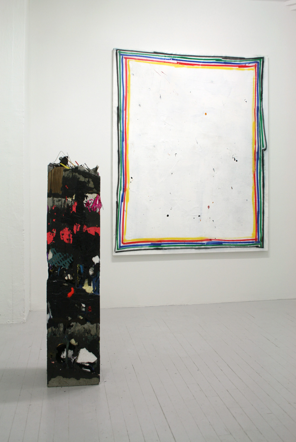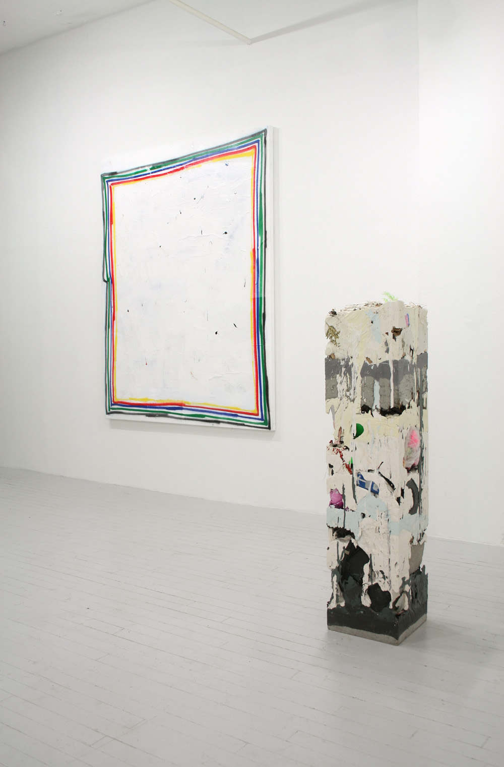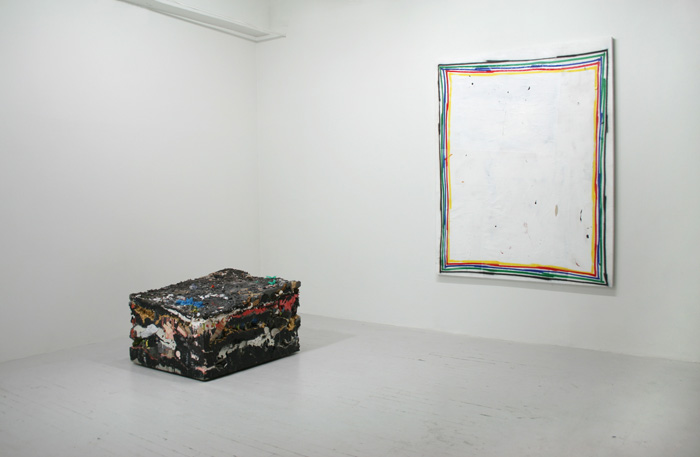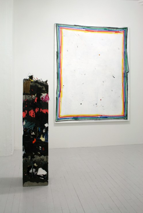 David Ostrowski’s intuitive marks — mistakes, he calls them — aggregate on the canvas like layers of paint. “It’s a constant failure,” he says in reference to his painting process, which is deliberately fast and intent on producing gestural imperfections. Indeed, there’s very little hand wringing here, as the artist’s trust in his mark making becomes palpable in the lines that he makes. At Nudashank Ostrowski, who is based in Cologne, Germany, is currently exhibiting three gritty paintings alongside the sculptures of Brooklyn-based Jack Henry. Both artists (on view at Nudashank through July 8th) share an affinity for that lyrical space that lies between painting and sculpture, as well as a penchant for provisional works that swap pristine ideals for a virtuous sense of human fallibility.
