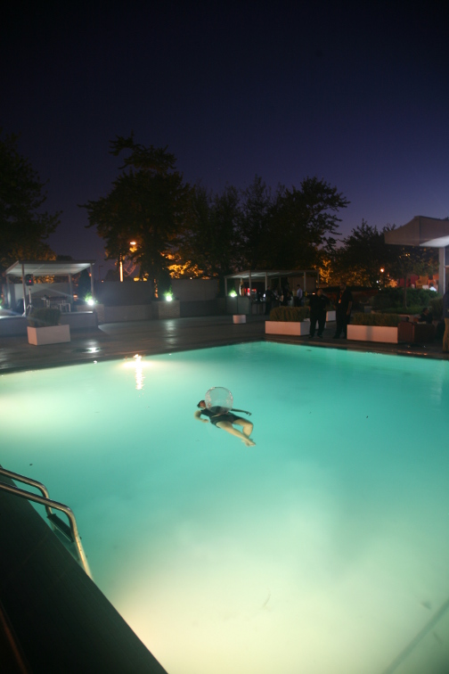 Looking around the ground floor of the Capitol Skyline Hotel, where independent artist projects were located, it was easy to imagine that conversation was in fact valued over commerce. On Thursday night,Chajanaden Harder’s performance Singularity, pictured above, was followed by Andrew Wodzianski Self Portrait as Ishmael, in which the artist floated adrift for 36 hours on a coffin in the pool, recreating the ordeal of Herman Mellville’s protagonist in the novel Moby Dick. I’m willing to surmise that making a sale was the last thing on the artists’ minds, but their participation, and that of artists like them, has quickly become an integral part of (e)merge.