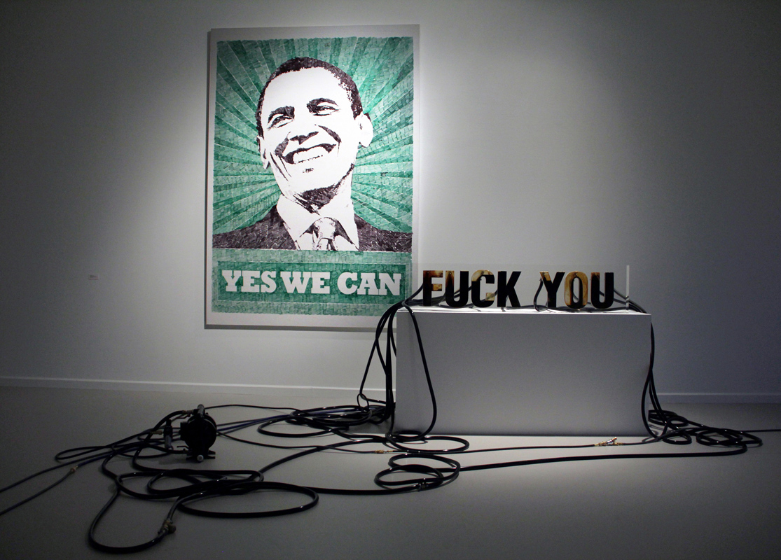 Take the artist’s large drawing of an Obama campaign poster. It’s plastered with the familiar motto “Yes We Can” and placed behind another of Molodkin’s molds arranged to spell out “Fuck You.” Step back, and the work reads “Yes We Can Fuck You.” Molodkin may lack nuance, but he makes up for it with rhetorical flair. That’s a gift in politics.