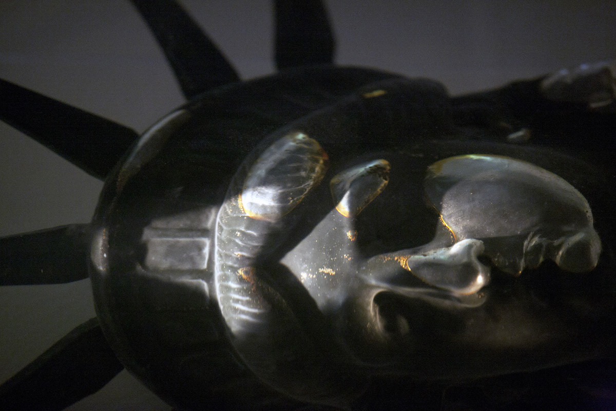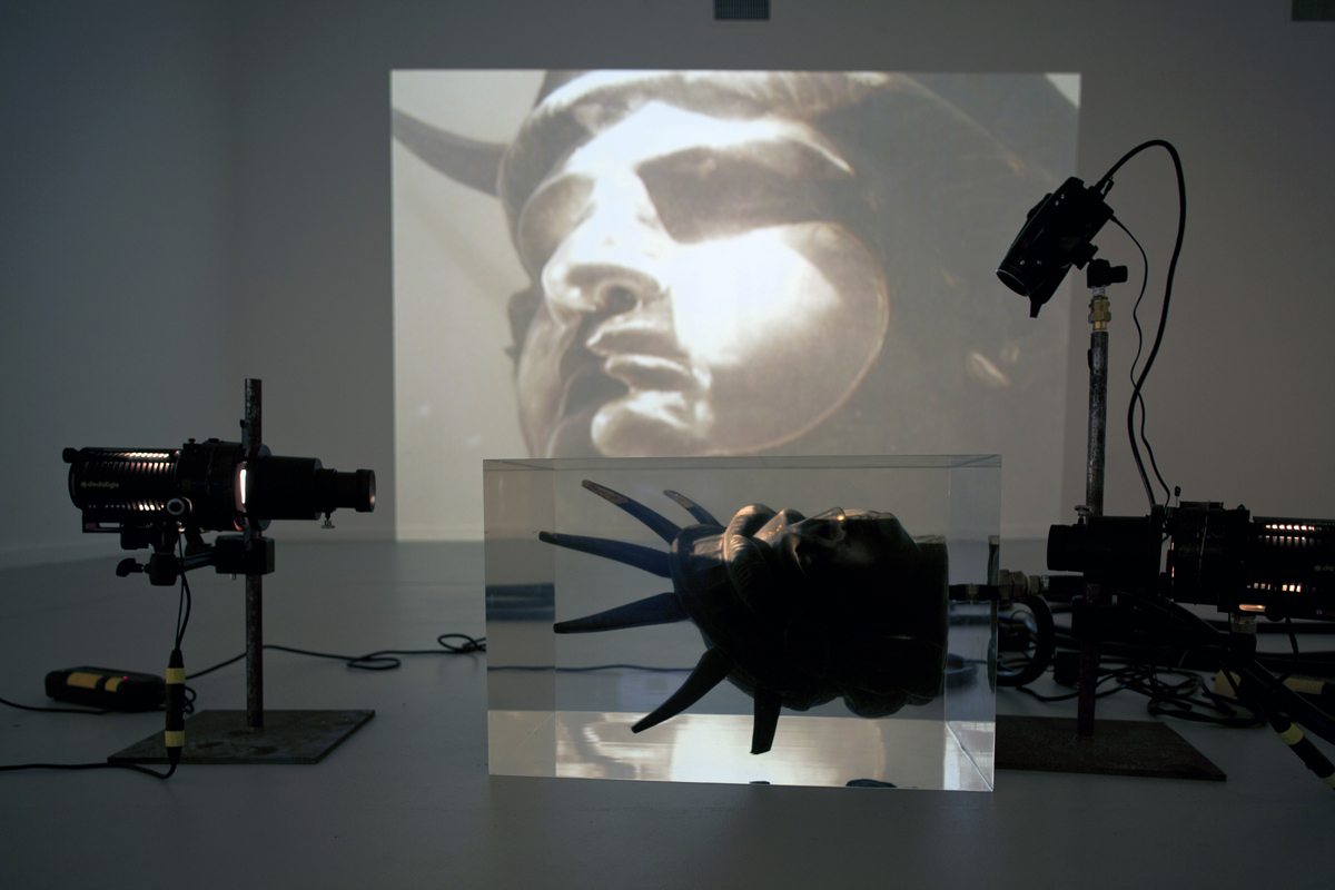 “Crude” comprises a series of transparent acrylic molds attached to plastic hoses that stretch across the museum floor. Texas oil, the crude kind, is pumped through the hoses and into the molds as multiple air compressors thump loudly in the background. When the installation is up and running, acrylic blocks spell the word “democracy” with their gooey, black contents. Elsewhere, molds of the disembodied head and torch-bearing arm of the Statue of Liberty are made to look like frozen lab specimens. A camera streams a grainy close-up of the statue’s face onto a wall projection like the lost footage of an investigative autopsy, the oil oozing and bubbling. It’s a statement on geopolitics that is about as subtle as an NRA rally.