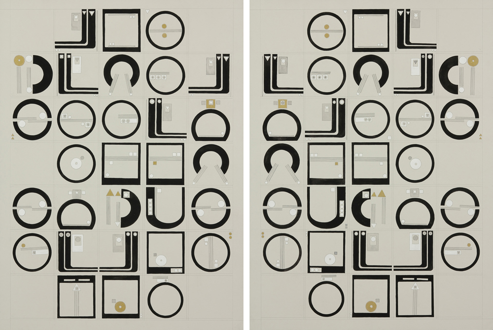 Hung alongside the paintings are a series of diptychs made in graphite and gouache on paper. Each diptych references a Walt Whitman poem using a lexicon of symbols adapted from Sir Thomas Moore’s Utopian alphabet. Smaller in scale and lacking the performative gestures of her larger works, it’s easy to overlook them. But the pairing is important. The diptychs, in their open ended semiotic language — are they modernist fonts? architectural plans? electronic circuity? — remind us that in abstraction meaning is ultimately constructed by us, the viewers. And that suits this savvy artist well.